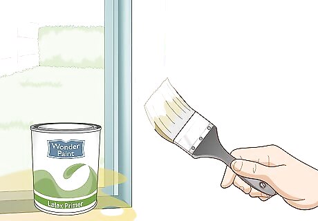 Roll on a coat of interior latex primer before painting your topcoats. While applying your primer, aim for a uniform coat of moderate thickness to prepare the surface to hold paint. A good primer will promote proper adhesion, protect against moisture and stains, bring out the color of your paint, and, in many cases, let you get away with using only a single topcoat. Mix a splash of your chosen paint shade in with the primer to more closely approximate the tone you have in mind for the finished surface. You have the option of either using the same roller for both priming and painting (remembering to clean the cover thoroughly with warm, soapy water between applications) or changing out your roller covers to save time.