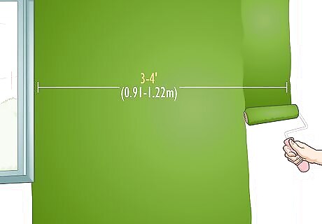 Work your way across the surface in 3–4 feet (0.91–1.22 m) sections. To make your strokes feel more natural, work from left to right if you’re right-handed and right to left if you’re left-handed. After completing a section, pause to check your coverage, then move onto the next. Continue in this fashion until you’ve painted the entire surface. When painting walls, roll the full height of the wall in each section to avoid creating seams. If you happen to notice any spots that you missed, go back over them by hand using a soft-bristle brush. Be careful not to use too much paint, or your touched-up sections may run.