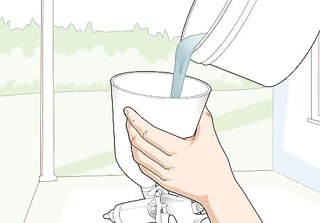 Stir and strain your paint to make sure it has a uniform consistency. Crack open a can of the paint you want to use and use a paint stirrer stick to mix it thoroughly, making sure you get all the way down to the bottom of the can. When you’re done, stretch a mesh paint strainer over the opening of a separate bucket and pour the paint into the bucket slowly. Taking the time to stir your paint and filter out debris will help minimize clogging, which is a common issue with paint sprayers. You can get away with skipping the straining phase if you’re using a fresh can of paint, but don’t proceed without stirring. This small preliminary step can make a big difference when it comes to ease of application and final coverage. If your work surface hasn’t yet been primed, fill the sprayer with an appropriate type of primer instead and apply a uniform coat. You can then go on to repeat the process described here using your primary shade of paint.