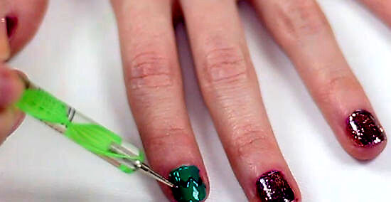 Give yourself a gold, purple, and green ombre. Ombre nails are popular and fairly easy to do. You can paint your nails green and purple and then use gold glitter nail polish for the ombre effect. All you need to create an ombre look at home is some nail polish and a makeup sponge. Start by painting your nails with the solid nail polish color(s) you have chosen. Then, allow the polish to dry completely. Next, use a makeup sponge to dab gold glitter nail polish onto the ends of your nails. Try to dab more glitter polish onto the ends of your nails to get the ombre effect. Use some nail polish remover on a cotton swab to remove any excess nail polish from your skin.