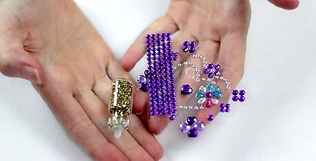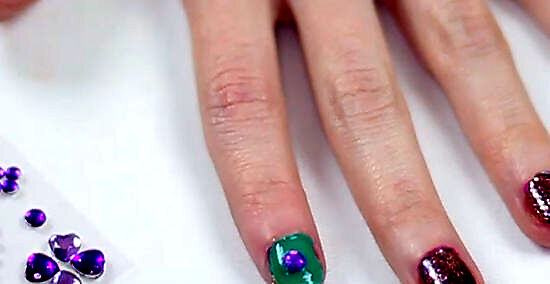Include an accent. Accenting your nails is optional, but it can add some extra dimension to your nail look. You can accent your nails with nail crystals, decals, or some nail art if you are up to it. For example, you could accent purple and gold nails with some gold nail crystals or sequins. Or, you could choose one nail to accent with a special design, such as a mask or some feathers.