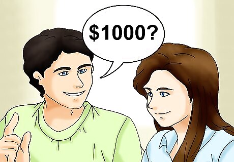 Find out how much your families can contribute (if anything). It can be difficult to ask your family for money. If you have a close relationship with your family, however, there’s a good chance that they would like to help you in some way if they can. Have a direct and forthright conversation with your parents, grandparents, or other loved ones you are close to about whether (and how much) they can chip in. Ask your partner to approach their family as well if they feel comfortable doing so. You might say something like, “Hey, Dad, Christine and I are starting to plan our wedding! We think we can cover the costs of what we have in mind, but it would be a huge help to us if you and Mom could contribute something financially. If not, we understand—just talk it over with Mom and let me know.” Your loved one(s) may want to contribute a certain percentage of the overall costs, or they may have more specific ideas about how they’d like to help. For example, maybe your favorite uncle would like to cover the cost of the wedding bands. Never ask with the expectation that the person you’re asking will be able to help. Be gracious if they say no, and thank them anyway.