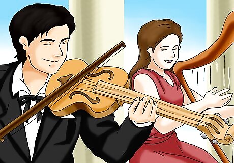 Hire someone to provide music for the ceremony and reception. You can use websites like GigMasters.com or Thumbtack.com to search for musicians who perform in the style(s) you’re interested in. Contact a few of your favorites to talk about pricing and scheduling. Try to book your musician(s) or DJ around 5 months in advance. If you can, see your potential musicians perform live so that you can get an idea of their sound and how they are with a crowd.