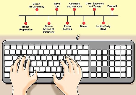 Create a planning timeline. Once you’ve set a date and squared away your budget, you can make the organizational process feel a little more manageable by putting together a timeline. Make a list of all the major tasks you need to get done (e.g., “Hire an officiant,” “Secure a venue,” “Buy a dress”) and set dates or date ranges for accomplishing each one. You can break your timeline down by month or week, or you can use specific dates as deadlines (e.g., “Order the cake by June 27th”). Do a search online for “wedding planning timeline” or “wedding checklist calendar.” There are lots of helpful planning templates available on the web. As the wedding date draws near, you’ll also benefit from having a detailed timeline of the day itself. Work with your officiant, party members, and any vendors/professional service providers to set an exact timeline and make sure everyone is on the same page.