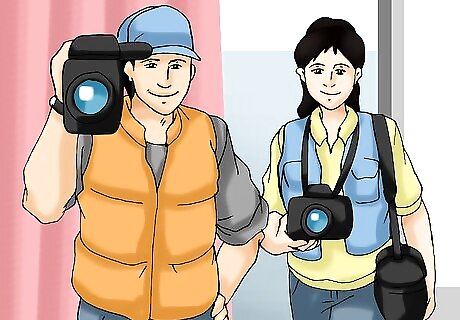 Get in touch with a photographer and/or videographer. Do an online search for wedding photographers and videographers in your area, and take a look at some portfolios. If you find someone whose work you like and who seems to fit your budget, do a search for online reviews before reaching out to talk to them. Try to meet with your potential photographer/videographer in person, if you can. Bring a list of questions (e.g., about their prices, style, preferred time of day to work, and how long it will take them to return the finished photos/video to you). Book your photographer and/or videographer around 8 months in advance.