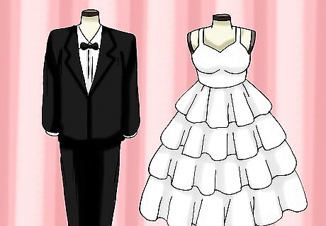 Purchase your wedding attire. If you are a bride, it’s a good idea to purchase your dress about 8 months in advance. You’ll need time to do a few fittings and get any necessary adjustments done in the months leading up to the wedding. Allow at least 6 months for purchasing and fitting dresses and suits for the wedding party. Make sure to bring your wedding shoes along when trying on dresses or suits. This will make it easier to coordinate your outfit and make sure that your hemlines are the right length. Don’t worry about sticking to traditional wedding attire if it’s not your thing. For example, if you’re a bride, maybe you’d rather wear a sleek pantsuit than a lacy wedding dress. You can also consider wearing an outfit or accessory that has sentimental meaning for you, like your dad’s old suit or your grandma’s veil. Consider factors like the overall look, date, and setting of the wedding. For example, you might want to wear a long-sleeved dress if you’re having an outdoor wedding in cool weather.