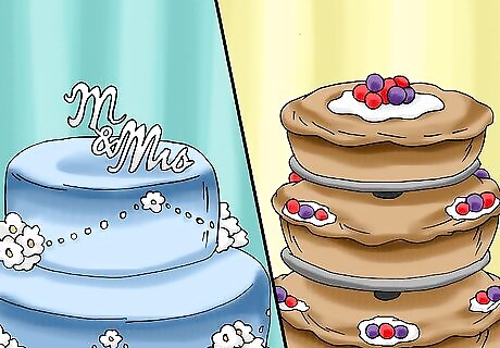 Order a cake or choose another dessert. Do a search for bakeries that make wedding cakes or other wedding dessert options in your area, and write down a few options that match your style and budget requirements. Some bakers need a lot of lead time to clear their schedules and design the cake, so try to book someone at least 5 months ahead of time. Remember, looks aren’t everything when it comes to cake! Schedule some tastings with potential bakers so you know what you’re getting will be as delicious as it is elegant. If you’d rather not go with a traditional wedding cake, consider alternatives like cupcakes, cake pops, pies, a candy buffet, a hot cocoa bar, or a chocolate fountain. You can even go savory instead of sweet with a cheese wheel cake.