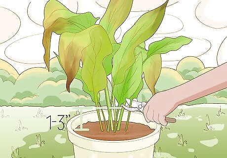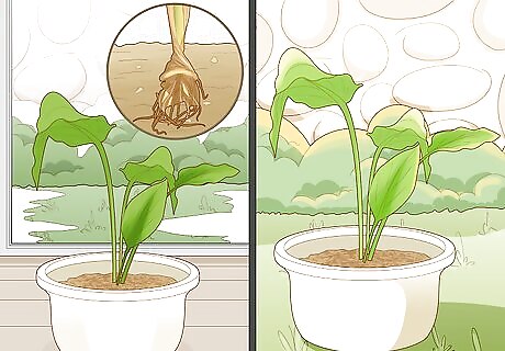 Transfer the stalks to their final pot once they’re 4–8 in (10–20 cm) long. Once your stalks have emerged, transfer them to a bigger pot or a section of your garden with sunlight exposure. To transfer a plant, pour soil halfway into a new pot. Dig your hands into your turmeric pot’s soil to find the rhizome. Carefully lift it out of the soil, moving topsoil out of the way by hand as needed. Space plants in the same planter or planter’s box at least 1.5 feet (0.46 m) apart from one another.Tip: Any pot that’s at least twice the size of your original container should provide more than enough space for your plant. Use the same soil you originally used to plant your rhizome. You don't need to transfer your plant if you’re growing turmeric in your garden. If you’re moving the plants into a planter’s box, dig your hole so that the plant has at least 1.5 feet (0.46 m) of space around it in every direction.