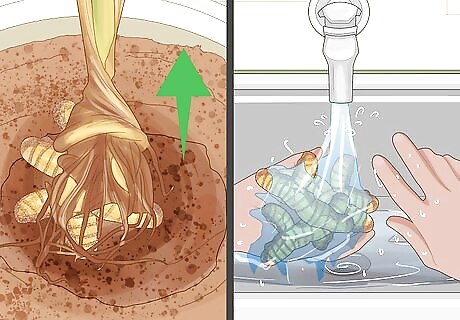 Remove the rhizome and wash it in the sink. Once you’ve cut the stem, pull the remainder of the plant out of the soil by hand. Cut or snap off the remaining stalk sections and take the mature rhizome to a sink to wash it. Run it under warm water and rub it softly by hand to remove the dirt and soil off of the rhizome. Don’t forcibly scrub the rhizome. Remove the outer layers of dirt and soil before grinding, using, or storing it.