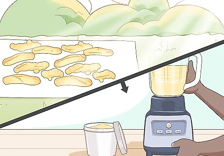 Grind your rhizome to make turmeric powder. Let your rhizome dry out in the sun overnight. Put on rubber gloves before making turmeric powder since the orange powder won’t easily wash off the skin. Cut your rhizome into smaller pieces and then grind it with a spice mill, grinder, or with a mortar and pestle until you’ve got a fine powder. You can use a food dehydrator set to 140 °F (60 °C) to dry your rhizome more quickly if you’d like. It’s ready to cut and grind once it’s brittle and dry. This process usually takes 30-45 minutes. Store turmeric powder in an airtight container to use turmeric later.