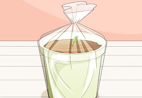 Slip your pots or planters into clear plastic bags. Get planter bags or large plastic trash bags and slip your pots inside. Set each pot at the base of an individual bag and fold it over at the top to restrict the opening. Place your turmeric in the area that you plan on storing it. If you’re planting your turmeric in a garden, plant them in a greenhouse if you can. If you can’t, consider making a miniature greenhouse for your plants. Your turmeric may still grow without a plastic bag or greenhouse, but keeping the plant humid is essential to making it sprout. If you can’t store it in a greenhouse or bag, mist your turmeric daily with a spray bottle filled with water. You don’t need to seal the bag. You want a little airflow to promote growth.