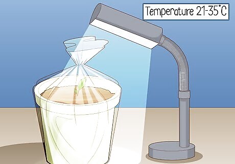 Store your pots or planters in a warm place between 70–95 °F (21–35 °C). Turmeric rhizomes grow best in higher temperatures. Nelson advises against planting in temperatures below 50 °F (10 °C), since your plant may die before it has had a chance to sprout. If you don’t have a warm place to store your turmeric, use a heating pad or desk lamp to keep it warm. If you don’t want to keep your turmeric artificially warm and have no appropriate place to store it, put it in a large plastic cooler in a temperate section of your home. It doesn’t matter if your plants are exposed to light at this stage in the growing process.
