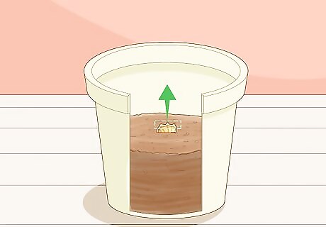 Lay a section of rhizome flat on top of the soil with the buds facing up. Nelson says to place a rhizome in the center of the soil. Rotate the rhizome so most of the buds face up toward the pot's opening. If the buds are on random sides of the rhizome, rotate it so that the majority of the buds are pointing towards the opening of the pot, even if they’re at an angle. The stalks of your turmeric plant will grow out of the buds, so as long as most of them are facing the opening of the pot, they’re likely to grow in the direction of the opening. Don’t worry about a stalk growing out the bottom of your pot or planter. It will die off when it can’t get any sunlight after growing.