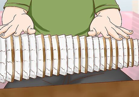 Create a glass harp. You can make a wine or water glass "sing" by running your finger around the rim. With a set of glasses, you can make a musical instrument with a sound remarkably similar to Ben Franklin's invention. Assemble a set of glassware. To create an instrument with a chromatic range of two octaves, you will need 25 glasses. For best results, use crystal glassware. The glasses don't need to be identical, but should be the same height for ease of playing. Select and tune the first glass by gently tapping on it or running your finger around the rim. Add water to the glass to lower the pitch until it plays the desired note. Use a guitar tuner, available online or at a music store, or download an app to your computer or phone. Take a glass of the same size as the first and add water until it is at the same level as the first glass. Test the pitch, then remove enough water to make the glass sound one half-step higher than the previous glass. Continue until you have tuned the glasses to complete the instrument. Use a permanent marker to indicate the appropriate water level, if desired. Set the tuned glasses on a firm base, making sure the glasses are attached to the base to avoid the glasses moving or falling over.