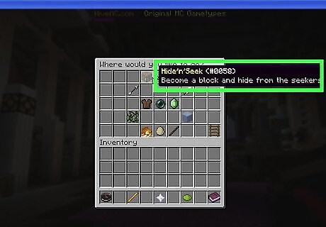 Expect to get chosen as a random block or, if you have the compass, what you chose. You have thirty seconds to run around and hide. Once you find a great hiding space, stand in there and don't even move your mouse. After five seconds, you are solid, so you look like the block. If you are a fence and go solid next to a fence, you will be attached.