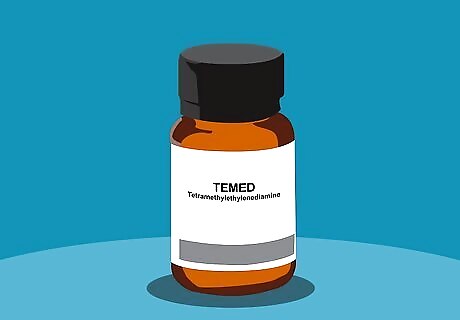 Add tetramethylethylenediamine (TEMED) last to catalyze the reaction. Once you've finishing bringing the rest of your components together, squeeze the TEMED in on top. TEMED is the primary catalyst used in gel electrophoresis. It will kickstart polymerization as soon as it enters the mix, so be prepared to cast your gel immediately after adding it. It’s critical to add the TEMED last, since it’s responsible for setting the reaction in motion. The procedure described here (as well as the order of addition) can also be repeated to prepare stacking gels—the only difference will be the exact quantities of each component.