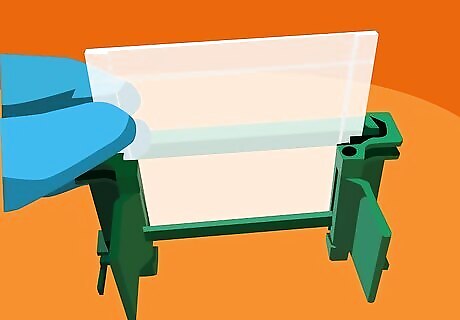 Set the casting frame into the body of the casting stand. Lift the U-shaped clamp on the top of the stand, insert the frame with the short plate facing outward, then lower it again to lock the frame down. Test the connection between the two pieces to confirm that the frame doesn’t shift or move around inside the stand. Once assembled, there should be just enough space between the two plates to pipe in your gel mixture.Tip: If you like, you can test the chamber for potential leaks by piping about 1 millilitre (0.034 fl oz) of deionized water into the gap between the plates. When you’re satisfied, drain the water carefully or slide a sheet of filter paper into the gap to soak up the excess fluid.