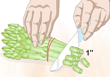 Trim 1 inch (2.5 cm) off the ends of the asparagus at home. Keep your asparagus in its rubber band, and cut about an inch off the bottom using a sharp knife. If your asparagus bunch is too thick to cut through, remove the rubber band and separate the bunch into 2 smaller bunches to trim. Trimming the asparagus at this stage removes the dead ends, allowing them to draw up water while being stored.