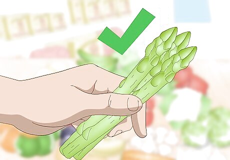Look for spears that are brightly colored. Seek out asparagus in your preferred variety that is vividly colored. Asparagus comes in 3 varieties: white, green, and purple. White asparagus should be bright white to slightly yellow. Green asparagus should be Kelly green with darker tips and ends, and purple asparagus should be a brilliant, dark violet. Brightly-colored asparagus is fresh and in good condition. There is little nutritional difference between the different colors of asparagus. Compared to green and purple asparagus, white asparagus may be more mild and turnip-like in flavor.