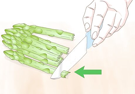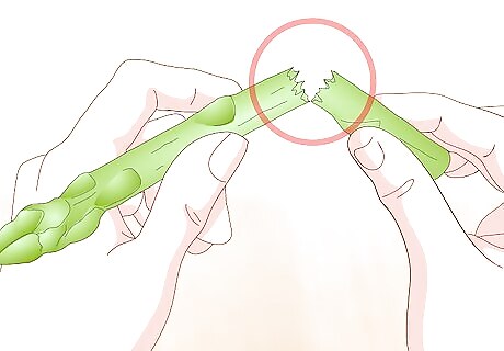 Trim off the uneven ends with a sharp knife. Use a sharp knife to create an even cut at the new, broken end of the tender spears. Trim off as little as possible, to preserve your delicious, moist asparagus.