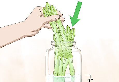 Stand your trimmed asparagus up in a glass container. Fill the container with about 1 inch (2.5 cm) of fresh water. Choose a glass container with tall sides, so your container won't tip over. Place the asparagus in the fridge. A mason jar or other narrow container works well to hold your asparagus vertically.