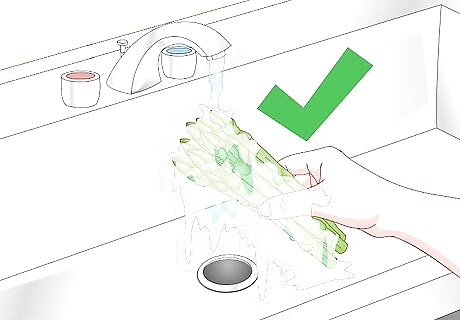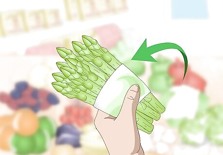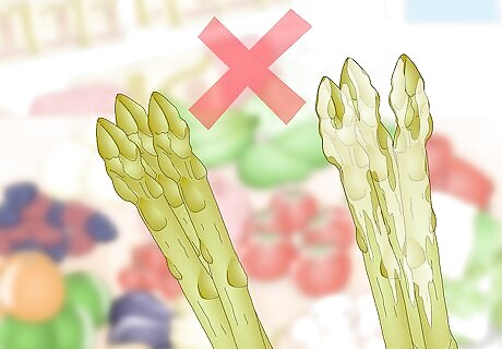 Pass over any asparagus that looks dried out or slimy. Look for asparagus that is unblemished and healthy. Avoid asparagus bunches with dried out stalks or tips that have begun to brown. The same goes for asparagus that is sticky, which may be a sign of rot or damage. If you don't feel confident about selecting asparagus, ask a grocery store associate or farm stand owner to help you select a nice bunch. Some asparagus may be stored upright in water at the grocery store. Assuming the water looks clear, this will keep the produce fresh longer. Avoid any slimy-looking asparagus stored in cloudy water.
