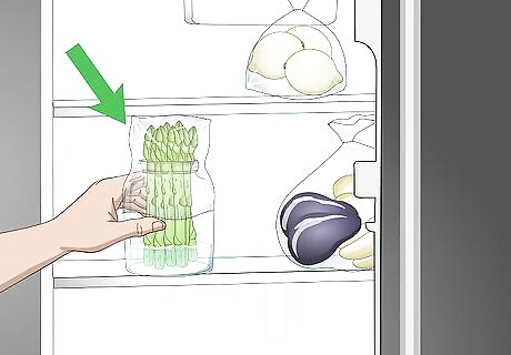 Store your asparagus in the refrigerator for up to 1 week. Cover your trimmed asparagus loosely with a plastic bag. Change the water if it begins to look cloudy. For the best results in your recipe, cook your asparagus within a week. If your asparagus browns or turns slimy, it is past its prime. Throw it out.
