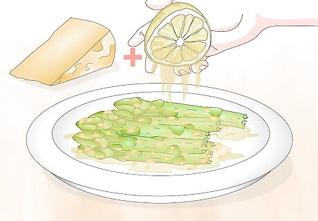 Create a simple preparation of asparagus with Parmesan and lemon. Blanch 1 pound (0.45 kg) of asparagus for 2 minutes and drain the hot water. While the asparagus are still warm, toss them with 2 tablespoons (10 g) of Parmesan cheese, a teaspoon of lemon zest, and 2 tablespoons (30 mL) of olive oil. Season the asparagus with salt and pepper to your taste.