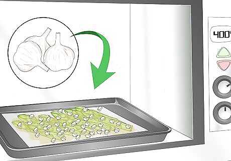 Roast your asparagus with garlic for a tasty side dish. Heat your oven to 400 °F (204 °C). Over medium heat on the stovetop, cook ⁄2 cup (120 ml) of olive oil, 8 cloves of minced garlic, 1 teaspoon (5 g) of onion powder, and 2 tablespoons (10 g) of chopped parsley until your garlic is fragrant but not brown. Drizzle the oil mixture over 2 pounds (0.91 kg) of thin asparagus, and season with salt and pepper. Roast your asparagus on a sheet pan for 8-10 minutes. When done, the asparagus should be bright green, deep purple, or slightly yellowed white, depending upon what type of asparagus you're using.