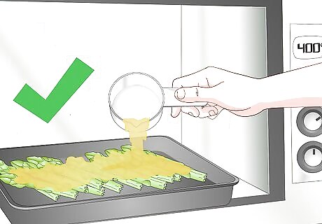 Create a cheesy roasted asparagus casserole. Place 2 pounds (0.91 kg) of prepared asparagus in a shallow baking dish, and heat your oven to 400 °F (204 °C). Pour ⁄4 cup (180 ml) of heavy cream over the asparagus and sprinkle the cream with 3 minced cloves of garlic. Scatter the top with 2 cups (250 g) of your favorite shredded cheese, such as provolone or mozzarella. Bake the dish until the cheese is bubbly and golden, about 25-30 minutes.