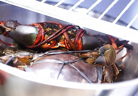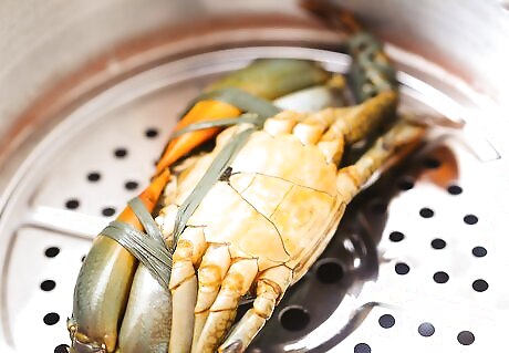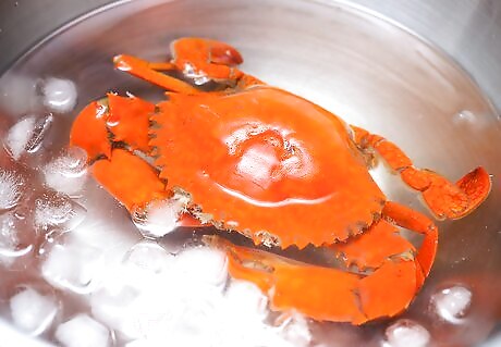 While the liquid is boiling, place the crab(s) in the freezer or in an ice-water bath. This will humanely stun the crabs before they are killed, while also helping to keep their limbs intact while they steam.