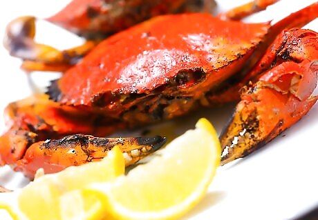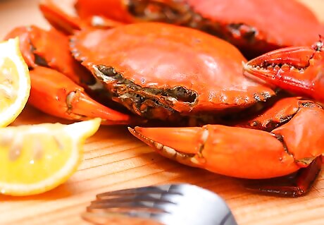 Serve immediately, or chill in the refrigerator and serve cold. Twist off the claws and legs of the crab. Use a crab mallet or a nutcracker to break the crab shell at the joints and then in the widest part of the shell. Place the crab upside down. Then pull up the tail flap (also called an "apron") and throw away. Turn the crab over and discard the upper shell. Then place the crab on its back again and wipe away the gills, innards, and jaw. Crack the crab in half and enjoy the meat inside the body.