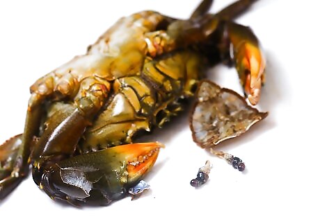 Clean the crab. Crack the claw (but do not break off) and remove the eyes, jaws, and tail flap (or apron), as well as flushing out the gills under cold water.