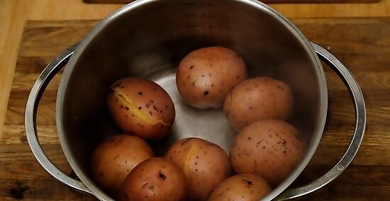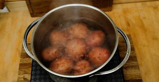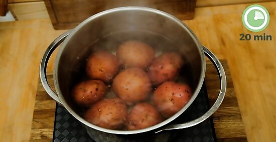 Boil the potatoes in a large pot with water for 25 minutes. Fill your pot of potatoes with cold water until the water is covering the potatoes. Place the pot on the stove and turn your burner onto its highest setting. Once the water has boiled, sprinkle in a large pinch of salt, turn the heat down so the water is simmering, and allow the potatoes to cook for about 25 minutes. You'll know the potatoes are done with they easily break apart with a fork.