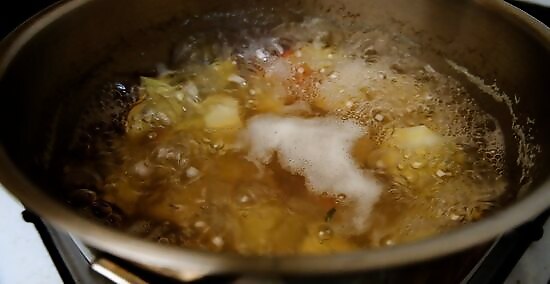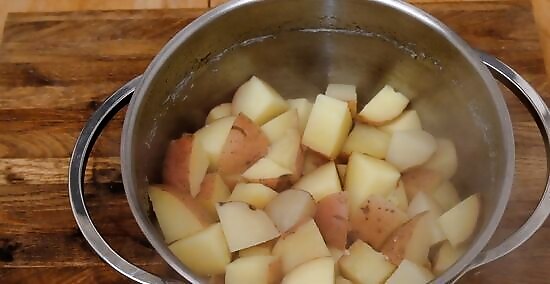 Drain the water from the potatoes. When the potatoes are soft, take the pot to the sink and drain the water either into a colander or by using a lid on the pot. Return the potatoes to the pot, place it on a burner at medium-high heat, and shake the pot to get the remaining water to evaporate. Then, turn off the heat and remove the pot from the burner.
