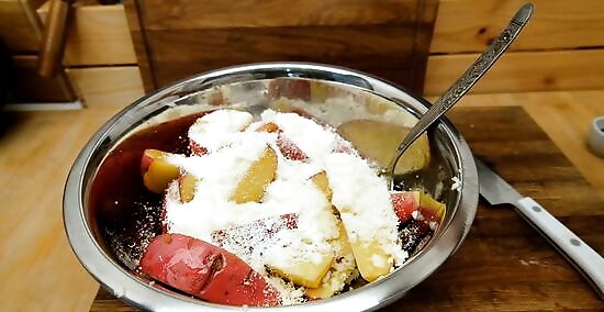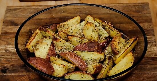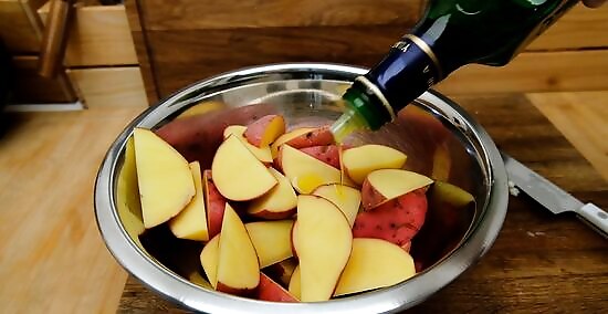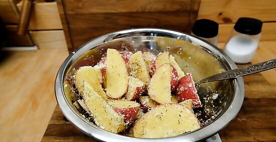 Slice each potato in quarters with a vegetable knife. Slice a potato in half, then slice each half into another half. Continue cutting the potatoes this way until you’ve cut all of them. Make sure each cut potato is roughly the same size so that they cook evenly. As you finish quartering each potato, place the pieces in a large mixing bowl and set it aside.