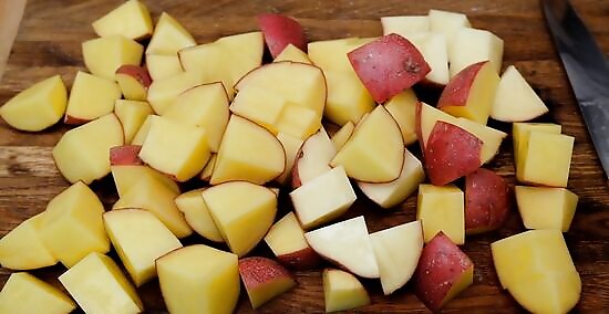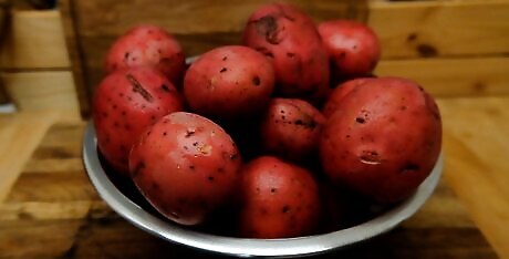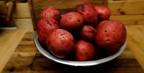 Wash 2 lb (910 g) of small red potatoes in cold running water. Hold each potato under cold running water in your kitchen sink. Scrub each one lightly with a clean scouring pad to remove any dirt that may be on them. Then, cut away any blemishes with a paring knife.