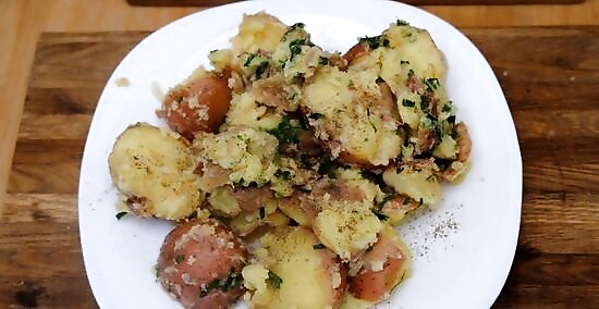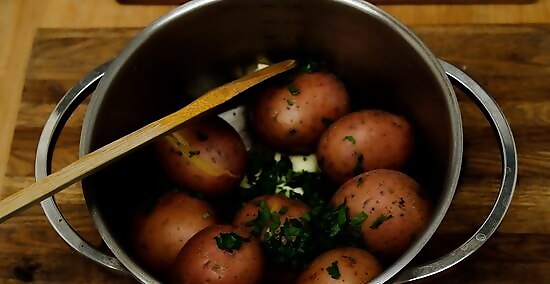 Add 3 US tbsp (44 mL) of sliced butter and 4 US tbsp (59 mL) of chopped parsley. Put the pot back on the stove but don’t turn the burner on. Add your butter and chopped parsley to the potatoes. You want to cover the potatoes with butter and parsley and have them break up a bit, but not stir so much that they become mashed.