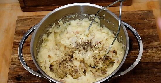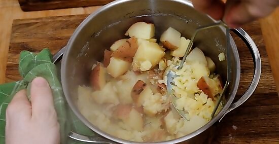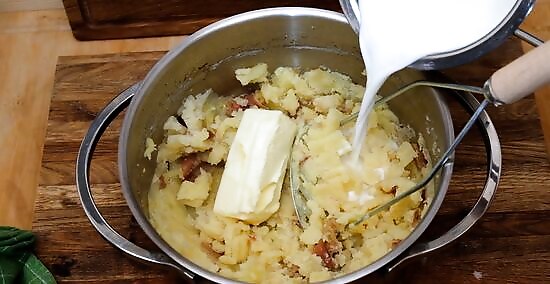 Add the butter and milk to the potatoes. If the butter is still firm, chop it into small pieces. Then, add your butter and milk to the potatoes and continue mashing until the butter and milk are completely blended with the potatoes. Don't forget to turn off your burner.