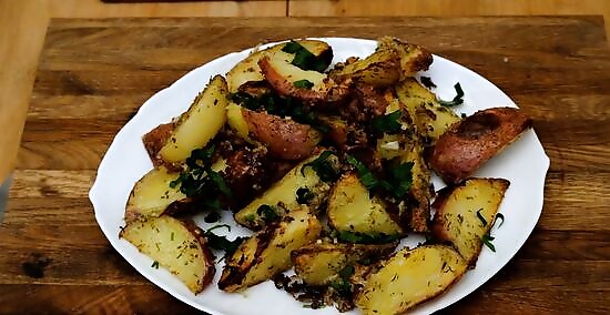 Garnish your potatoes with a handful of parsley and serve them warm. If you like, you can chop a handful of fresh parsley into tiny bits and sprinkle it over your pan of potatoes as garnish. When you’re finished, use a spatula to move your potatoes onto individual plates, and enjoy!