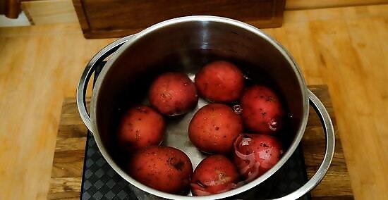 Wash 6 lb (2,700 g) of small red potatoes. Hold each potato under cold running water in your kitchen sink. Scrub them lightly with a clean scouring pad to remove any dirt that may be on them.