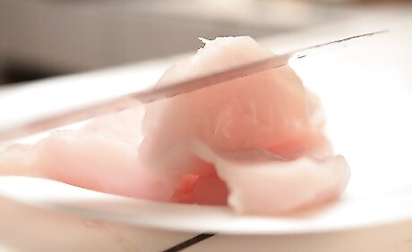 Prepare trout to be cooked. Select a trout to cook that is an ideal weight of 2 to 4 lbs. (1 to 2 kg). Larger trout are breeders and should be released to maintain the trout population. It may be tempting to keep a larger fish, considering it a prize or a plentiful meal; however, the flavor of a larger trout is not as good as that of the smaller ones. Cut off the trout's head and tail. This step is optional. Completion of it is solely preference and will not affect the cooking time or flavor of the fish. To do so, cut up from the throat across the soft area between the collarbone and the gills. Remove the guts from the trout. Use your knife and make a cut along the underside of the fish from its anus, along the stomach to its throat. You will expose the entrails. Grab hold of them and pull them out. Rinse the trout with clean, cold water. This will remove any blood, dirt and debris from the fish. Blood on the fish is part of what makes the trout have an overly fishy taste. Fillet the fish. With the belly side of the fish facing upward, take your knife and cut upward along the backbone. The blade of the knife will follow the outside of the fish's ribs. Then cut down to the backbone from the top side. The cuts will be the entire length of the trout, from the gills to the tail. Repeat the filleting cuts with the meat on the other side of the backbone. Take out any remaining bones. There should be a row of bones remaining in the center of each fillet. Slide the blade of your knife just under this row to remove the bones.
