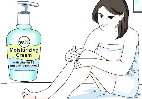 Keep your skin moisturized. Before you go to bed at night, rub some moisturizing cream on your skin. Coat your legs and feet thoroughly. A quality cream will leave your skin feeling saturated, not greasy. Look for one that contains vitamin B3 and amino-peptides. Moisturized skin is less likely to crack or break. It’s also healthier and can better fight off minor infections, such as eczema, which can lead to cellulitis. To keep your feet even more hydrated, wear socks after applying lotion. A lotion is a lighter moisturizer than a cream. So, choose a lotion if you want something to apply throughout the day as well. Creams are best to use before bed and with severely dry skin. Look for a product that is noncomedogenic, (it won’t clog your pores). If your skin is already cracked, talk with your doctor before applying any products. Your doctor might suggest a prescription cream.