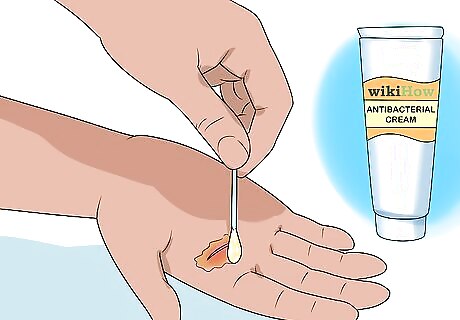 Rub antibacterial ointment on the injury. Use a cotton swab to coat your injury with a layer of antibacterial cream. Repeat this process daily until you are healed. If your wound is fairly superficial, an over-the-counter cream will work. If the wound is deeper, then talk to your doctor to get a more powerful ointment. Follow the ointment’s directions carefully. Topical medications can sometimes slow down healing if overused.