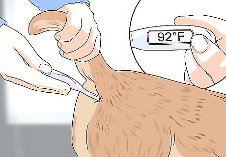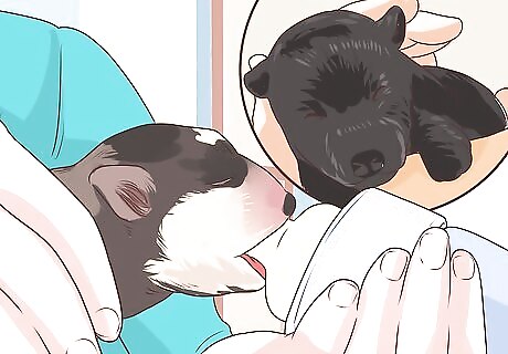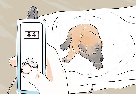 Take the puppies’ rectal temperatures. A newborn puppy’s body temperature should be between 95 and 99 degrees Fahrenheit (35 and 37 degrees Celsius). A body temperature below 95 degrees Fahrenheit is dangerous—the puppy’s heart will slow down and the digestive tract won’t work very well. If any of the puppies’ body temperatures drop below 95 degrees Fahrenheit, slowly warm them up over two to three hours. Place the cold puppy on a hot water bottle. Wrap the water bottle with a towel so the puppy’s skin doesn’t get burned. The puppy will likely move off the water bottle when it warms up.