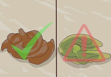 Examine the puppies’ feces. The color of a newborn puppy’s feces can indicate whether the puppy is healthy or not. After you stimulate each puppy to defecate after a meal, look at the color of the feces. The feces should be brown and partially formed. If the feces are green, the puppy likely has an infection. Contact your vet if you see green feces. Your puppy will need to be treated for the infection.