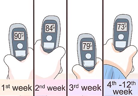 Adjust the environmental temperature each week. In the first two weeks of life, newborn puppies cannot regulate their own body temperature. Until the puppies are four weeks old, you will need adjust the temperature to keep them warm and comfortable. Reposition the heat sources and continue using a thermometer: First week: 84 to 90 degrees Fahrenheit (29 to 32 degrees Celsius) Second week: 79 to 84 degrees Fahrenheit (26 to 29 degrees Celsius) Third week: 73 to 79 degrees Fahrenheit (23 to 26 degrees Celsius) Fourth through twelfth weeks: 73 degrees Fahrenheit (23 degrees Celsius)