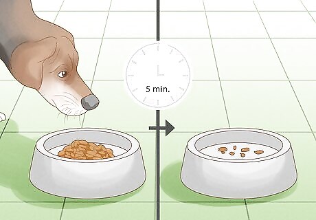 Give your dogs an amount of food they can finish in less than 5 minutes. Only feed your dogs as much as they need during their meal times so they don’t leave any food in their bowls. That way, your dogs will only focus on eating their meal rather than fighting over food. Aim to give your dogs ⅔-1 cup (148-224 g) of food per meal so they have 2 cups (448 g) total throughout the day. Don’t move the bowls before your dogs are finished eating since it could increase how protective they are of their food and may make them more aggressive.