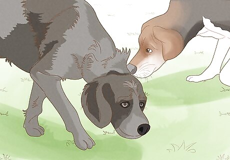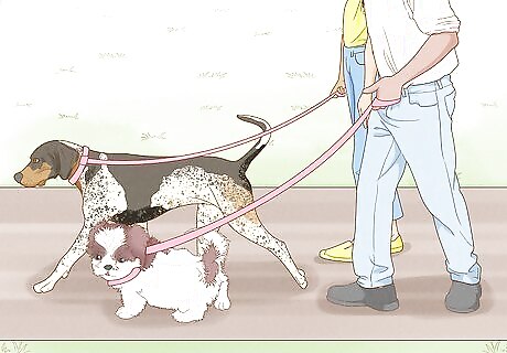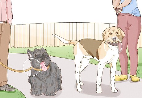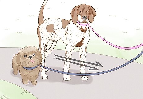 Mix play or walking with short interactions until the dogs are calm. Keep alternating between short interactions where the dogs sniff each other and play, obedience training, or walking side-by-side. That way, the dogs can get to know each other, but they won't have much time to get aggressive before you're distracting them with something fun again. If the dogs seem aggressive, pull them apart and try a short introduction again in a bit, though keep them a little farther apart from each other so they can't touch. Once the dogs seem less excited and calm, you can likely take them home together.