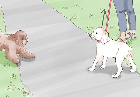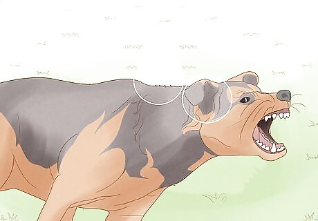 Watch for signs of aggression in your dog and other dogs. These can include growling and snarling, as well as standing up tall. They may have stiff posture. Look at their ears, which may be raised, along with the hair on the head and back. They're also likely to move slowly with purposeful steps while they stare at your dog. If you notice these signs, get away from other dogs if at all possible. If you’re taking your dog for a walk and you suspect that it may get aggressive with another dog on your path, pass the other dog in a wide arc so the dogs don’t feel like they need to confront one another.
